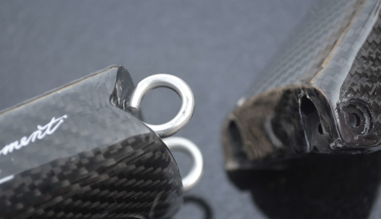 エポキシ樹脂とガラスバブルのフルソリッドボディをカーボンでハウジングした特殊構造をルアーで実現。巨大なプラスチックルアーが抱える着水によるルアーへの浸水、ストラクチャーに強くコンタクトしても破損のトラブルはありません。