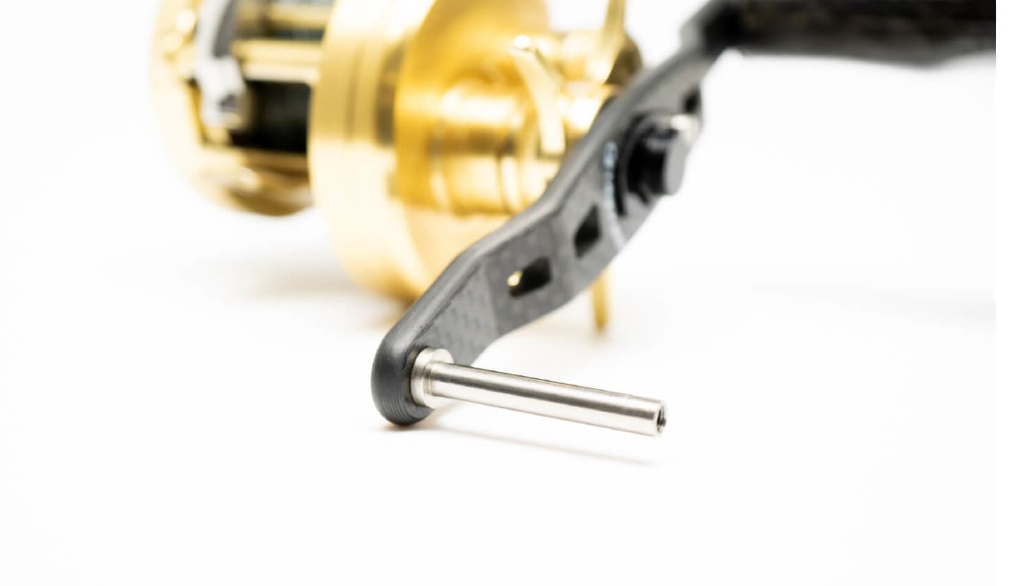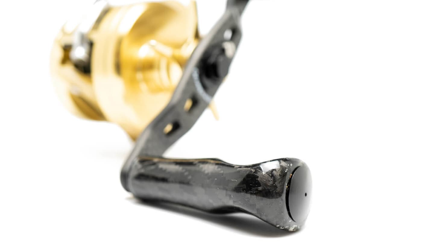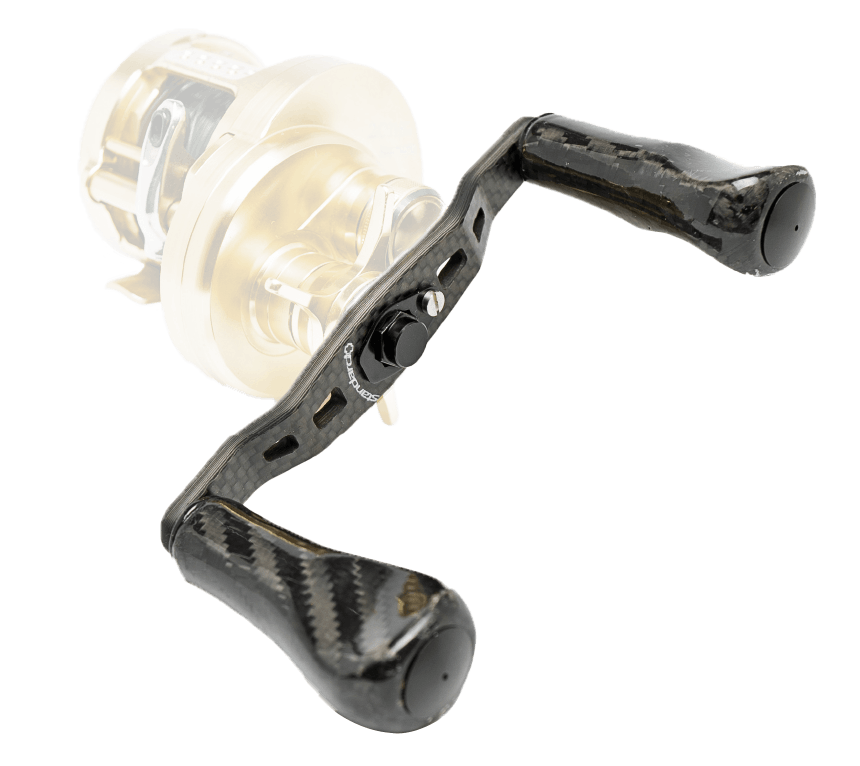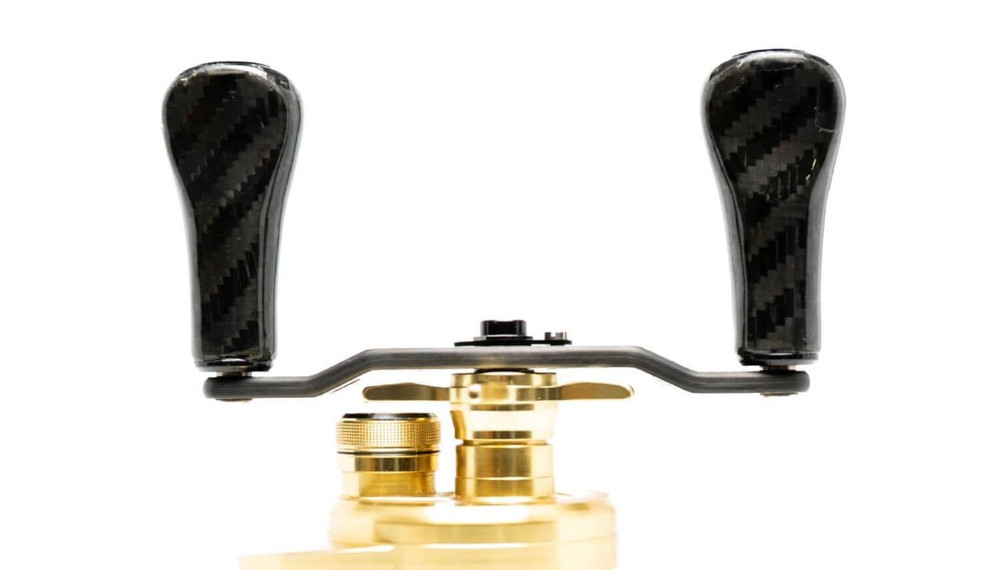 ハンドルとは、リールからハンドルをグリップする位置を離すとトルクがなくなり、巻き抵抗が増える。「巻き抵抗が増える=僅かな変化も捉えられる。」と言う理論から導き出された形状。リトリーブ時は、端をグリップし、感度を高める。魚が掛かってからは従来通りに握りこめる。軽量で高剛性、極限まで感度を追い求めたモノコック(中空構造)カーボンノブを特殊ラバーコーティング。
